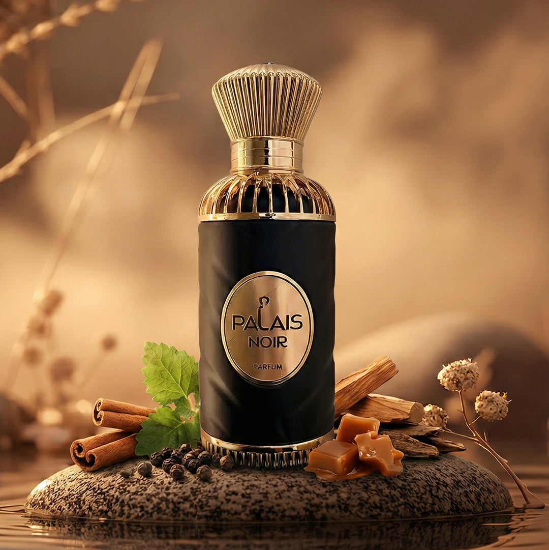 Palais Noir by AMD Perfumes is a warm spicy and woody opening with a bold refined feel, presented in a deep black bottle with rich gold detailing that reflects depth and luxury. The fragrance unfolds into a smooth blend of sweet warmth and woody richness, while the textured black box with intricate gold pattern adds a refined, complete experience.